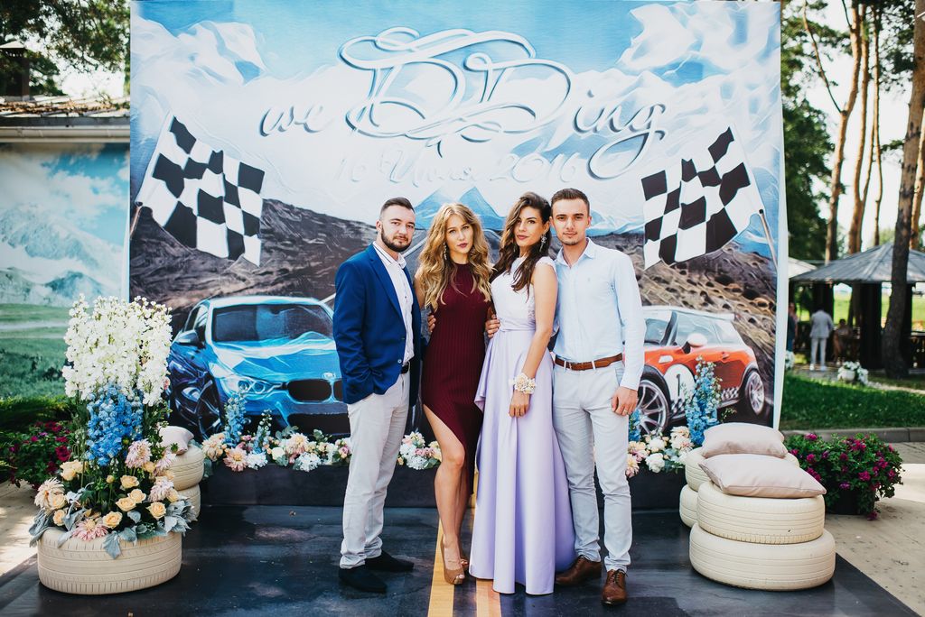 Оформление поразило всех гостей, особенно огромная арка, высотой в пять с половиной метров. Ее объемы ни сколько не противоречили воздушности и легкости. Также друзей потрясла фотозона — автомобили молодоженов на трассе и объемные клумбы в виде шин.