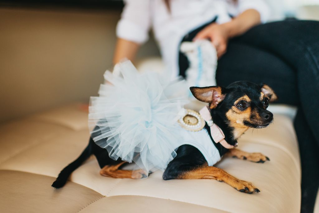 Платье невесты украшали крупная ажурная вышивка ручной работы и длинный шлейф. Струящаяся трехметровая фата прекрасно дополняла бальный фасон свадебного платья. Туфли, также ручной работы, из кожи питона и страз заказывали специально для Даши. Смокинг жениха, в классическом черном, и бабочка, закончили изысканность нарядов пары. Запонки фирмы DuPont с обозначением буквой “D”, подаренные невестой перед свадьбой, украсили манжеты рубашки.