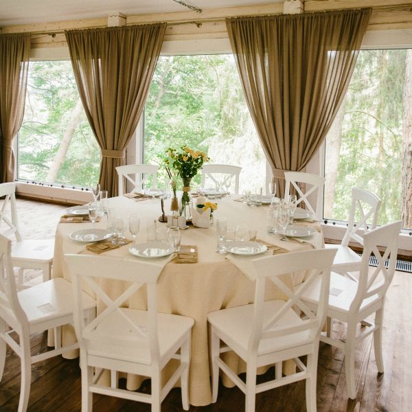 Площадка находится в Калужской области, 110 км. от МКАД в невероятном сосновом бору. С 2012 года он принимает гостей, и для их размещения существуют различные категории домиков с панорамным остеклением. Банкетный зал так же имеет панорамные окна и веранду. Вы можете сами выбрать место для регистрации в соответствии со своими предпочтениями и концепцией свадьбы. Стоимость банкетного зала на 50 человек и прилегающей территории составит 80 000 руб. Меню на одного человека – 4 000 руб., пробковый сбор – 450 руб. и обслуживание 11%.
