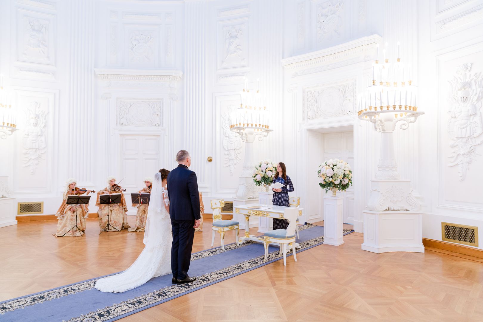 • 62 500 р.: аренда зала, вход для гостей (до 25 человек), лакеи, музыкальное оформление в исполнении струнного квартета, регистратор, торжественная встреча гостей на территории дворца, координатор церемонии. Продолжительность церемонии - 1 час.