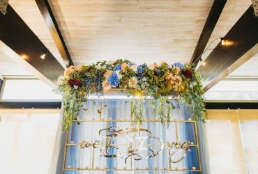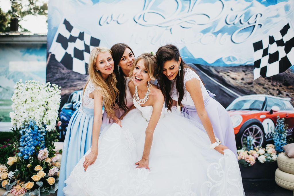 Оформление поразило всех гостей, особенно огромная арка, высотой в пять с половиной метров. Ее объемы ни сколько не противоречили воздушности и легкости. Также друзей потрясла фотозона — автомобили молодоженов на трассе и объемные клумбы в виде шин.