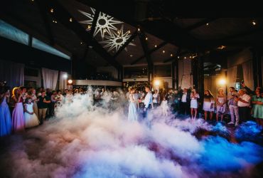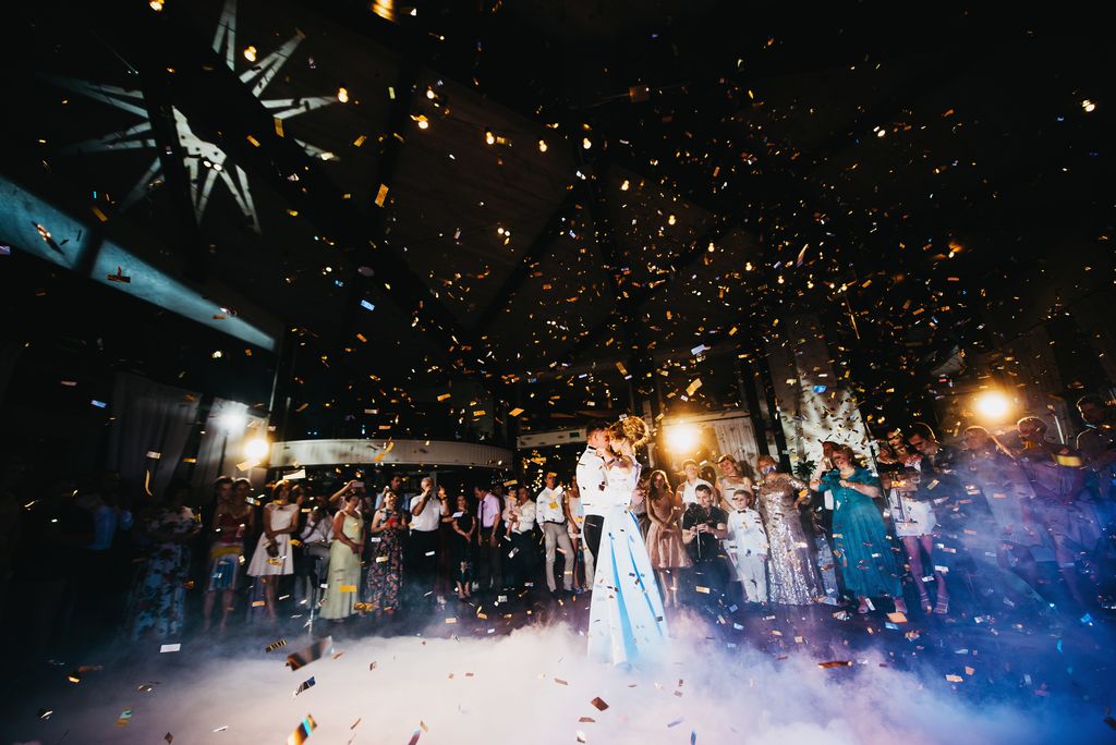 Молодожены не давали гостям скучать и подготовили массу сюрпризов: оригинальный постановочный танец молодоженов со спецэффектами. Невеста, в живом акустическом сопровождении кавер-группы, исполнила песню в подарок жениху.