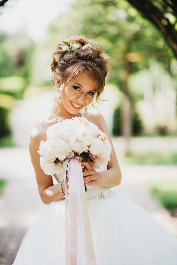 Платье невесты украшали крупная ажурная вышивка ручной работы и длинный шлейф. Струящаяся трехметровая фата прекрасно дополняла бальный фасон свадебного платья. Туфли, также ручной работы, из кожи питона и страз заказывали специально для Даши. Смокинг жениха, в классическом черном, и бабочка, закончили изысканность нарядов пары. Запонки фирмы DuPont с обозначением буквой “D”, подаренные невестой перед свадьбой, украсили манжеты рубашки.