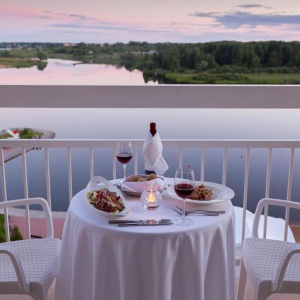Отель находится в Тверской области в деревне Вараксино (110 км. от МКАД) на песчаном береге Волги, построен совсем недавно - в 2017 году. 230 номеров с видом на реку, спа-центр с бассейном, гольф клуб, несколько ресторанов, детский клуб - все находится в одном месте. Вы сможете провести свадьбу своей мечты в летнем шатре на 50 гостей у воды с прилегающей пляжной территорией. В подарок от отеля - номер молодожёнам. Стоимость меню начинается от 4 600 на человека, обслуживание 15%. При желании использовать свой алкоголь оплачивается пробковый сбор - 850 руб на гостя. Цены на аренду площадок в отеле: шатер – 90 000 руб., выездная регистрация – 15 000 руб., место для проведения фейерверка – 11 000 руб.